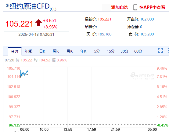 美伊谈判无果而终,4月13日早盘,布油、WTI原油期货开盘跳涨8%,截至北京时间7:20,布伦特原油涨超8%报103.34美元/桶,纽约原油涨超8%报105.221美元/桶。